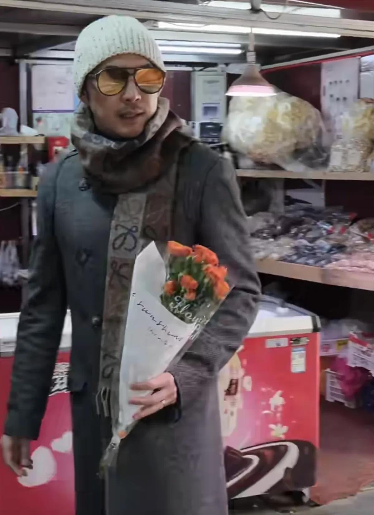 出门去买菜都要秀一下范儿,穿着十年前的大衣戴着围巾,还拿了安吉的帽子,大秀都市型男风范。