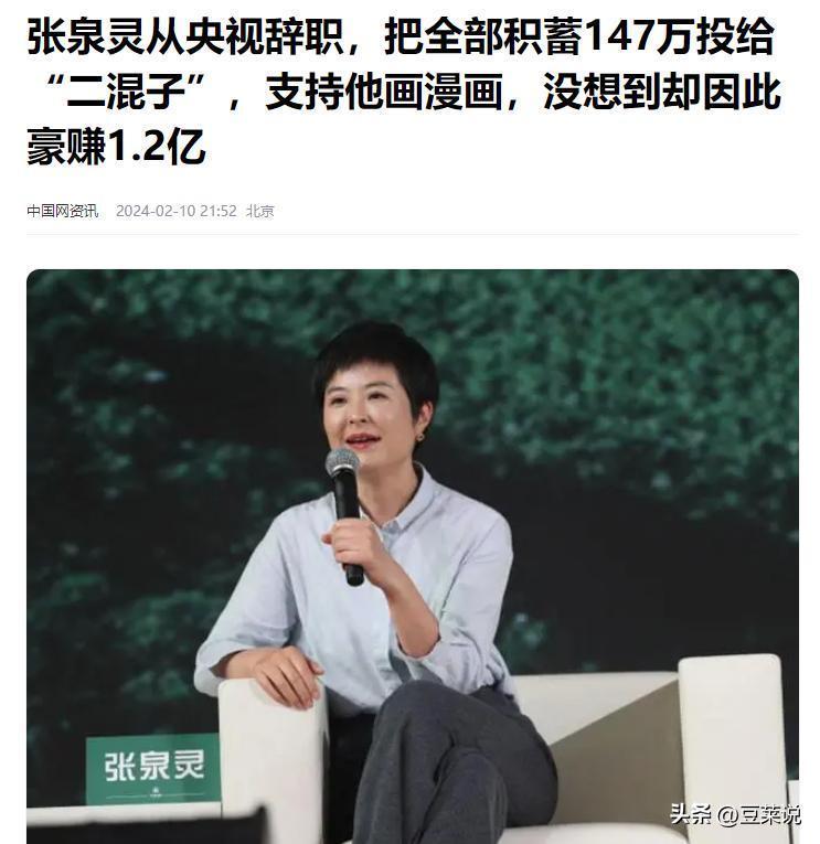 信息来源:中国网资讯2024.2.10——张泉灵从央视辞职,把全部积蓄147万投给“二混子”,支持他画漫画,没想到却因此豪赚1.2亿