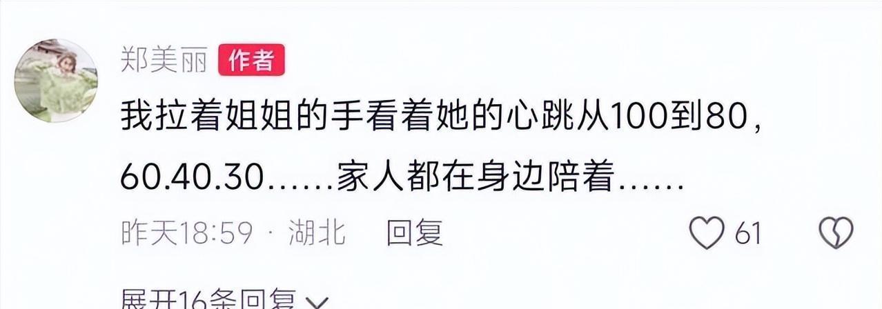 郑美丽的妹妹在评论区说:“我拉着姐姐的手看着她的心跳从100到80,60.40.30……家人都在身边陪着……”。