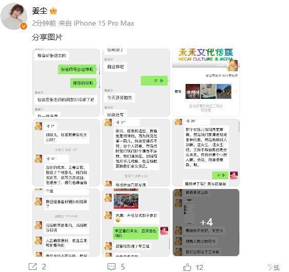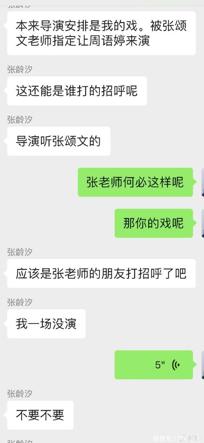 在官方声明之前,姜尘发文公开多张聊天截图,矛头再次指向张颂文,聊天截图是《日掛中天》原定女演员张龄汐控诉自己的戏被张颂文指定让周语婷来演,导演都听张颂文的,姜尘则以“张老师”内涵张颂文,周语婷还说自己一场戏都没演,录音组都崩溃了。