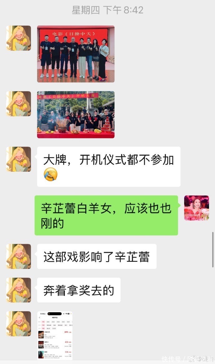 另外,姜尘曝光与“禾采文化传媒”的相关人士聊天截图,对方称是张颂文电影的投资人,爆料张颂文换了他们家的女演员,不知道张颂文和周语婷是什么关系,又说冯绍峰是来客串,人品很好,还吐槽大牌都不来参加开机仪式。