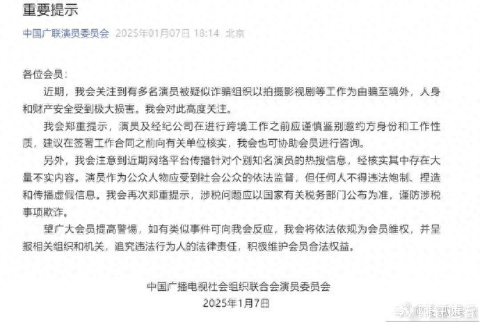 1月7日,中国广播电视社会组织联合会演员委员发布重要提示,关注到有多名演员被诈骗到境外,造成人身财产安全损害,对此高度关注。