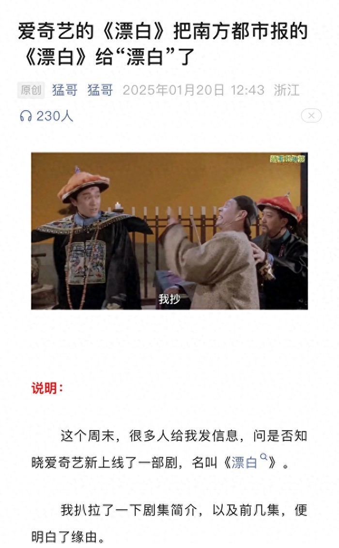 1月20日,一篇名为《爱奇艺的<漂白>把南方都市报的<漂白>‘漂白’了》的文章引起关注。该文章作者称,“这个周末很多人给我发消息,问我是否知晓爱奇艺新上线了一部剧,名叫《漂白》。我扒拉了一下剧集简介,以及前几集,便明白了缘由。爱奇艺这部名为《漂白》的新剧,无论是剧名还是剧情,‘漂白’了我2012年发表于南方都市报的深度调查报道《漂白》。”此外,在文中该作者还表示,“爱奇艺的《漂白》创作团队事先没有联系我或南方都市报,在宣发材料中,也没有标示原作出处。”