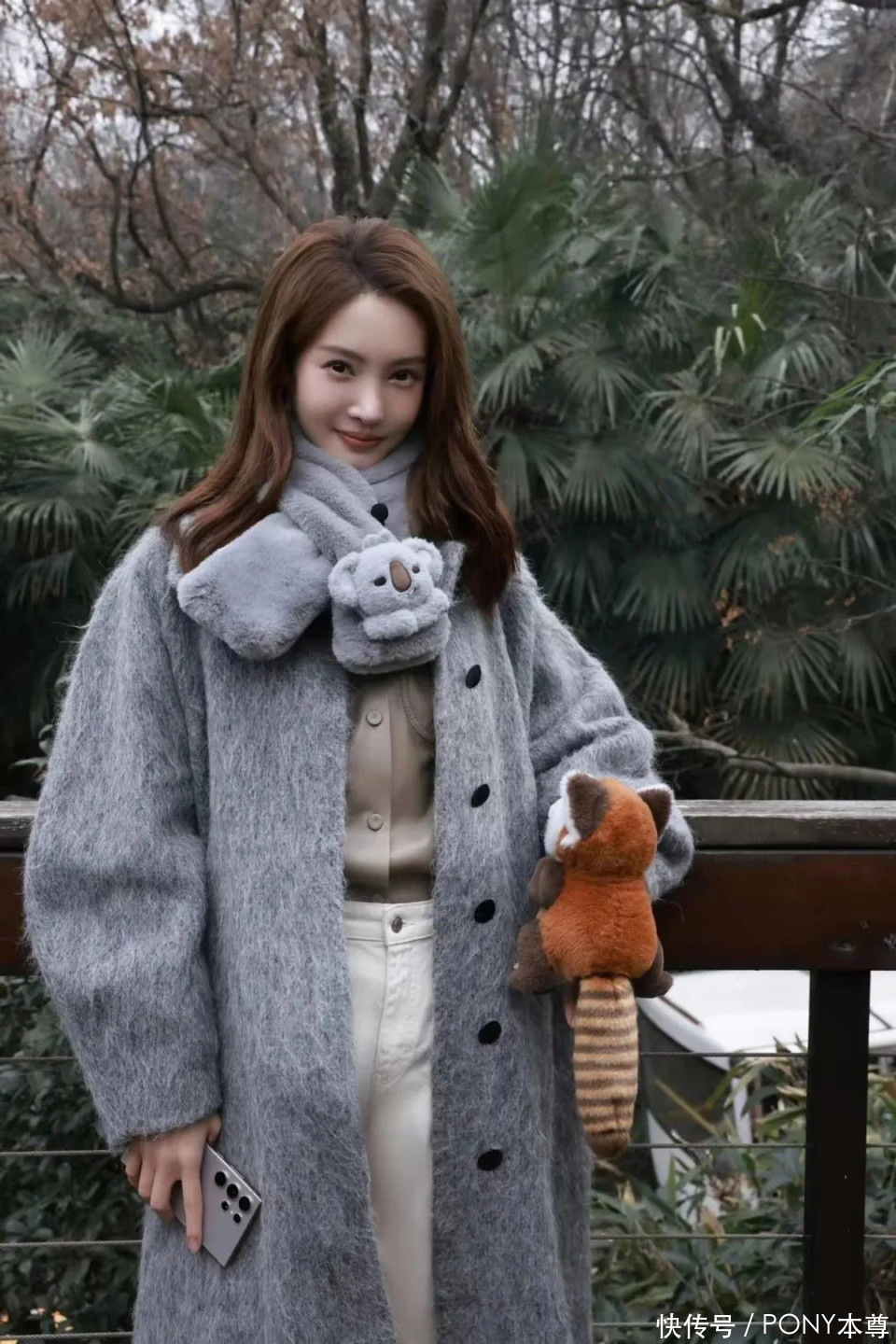 又比如她的大衣穿搭,灰色的毛绒大衣搭配毛绒围巾,内搭卡其色针织开衫和白色牛仔裤,让她尽显青春气息。