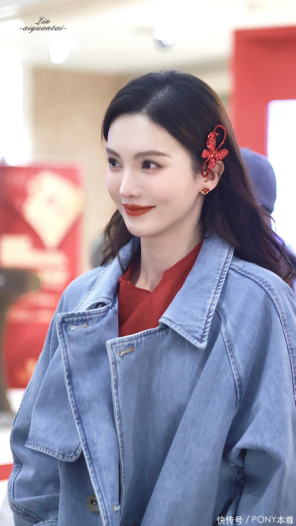 除了舞台上让人惊艳!她的上班私服穿搭也相当不错!比如春晚彩排期间,她身穿牛仔风衣外套,头发上佩戴红色蝴蝶结发夹,搭配大红唇,美的很动人!