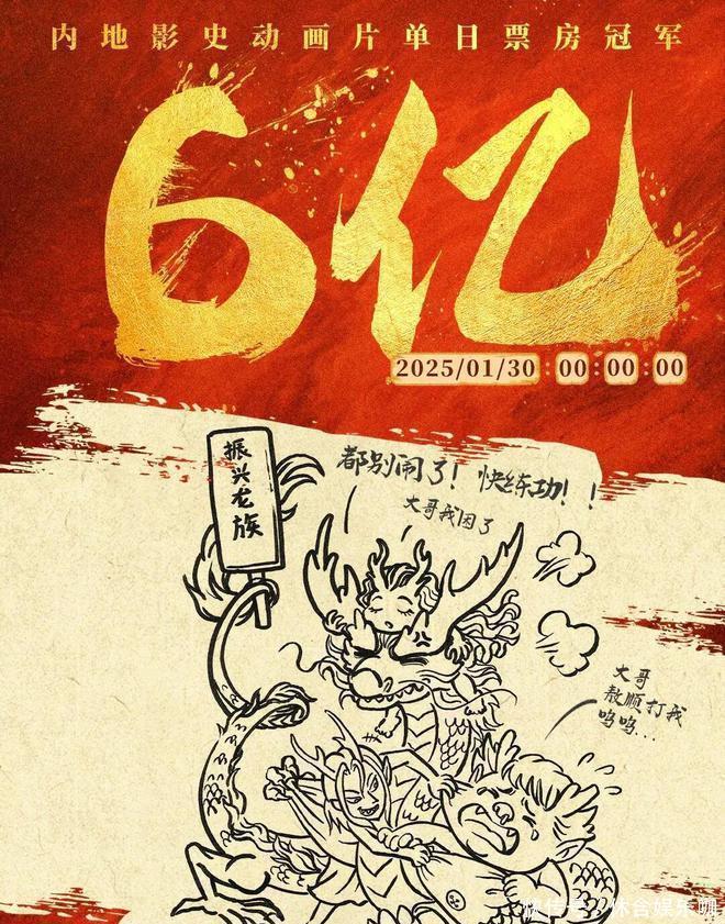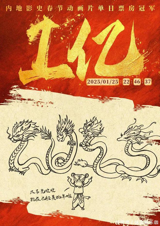 电影《哪吒》在预售的时候就破亿,电影正式上映前一天票房破三亿。饺子导演开始画破亿手绘海报。彩条屋一下子放出三张票房海报。一亿的海报上哪吒让龙族收收爪子,他说现在已经是蛇年了。
