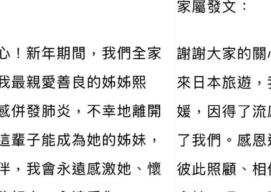 小S(徐熙娣)在社交媒体上发布长文,回忆与姐姐的点点滴滴,字里行间满是悲痛。