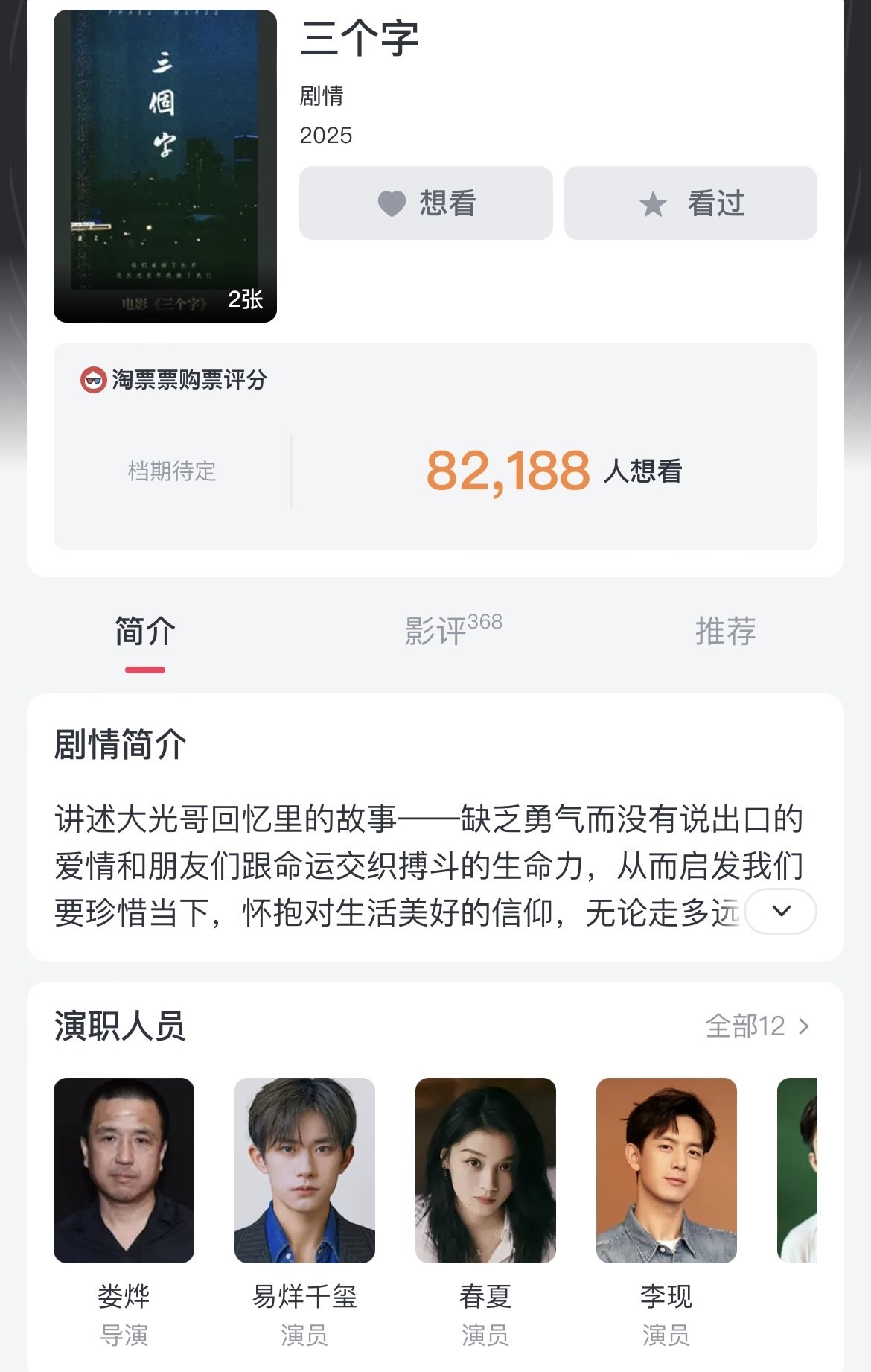 相信在娄烨导演的精心打造下,以及易烊千玺、李现等主演的精彩演绎下,《三个字》将会成为一部备受赞誉的电影佳作。随着上映日期的临近,观众对这部电影的期待值也在不断攀升,让我们共同期待它的精彩绽放。