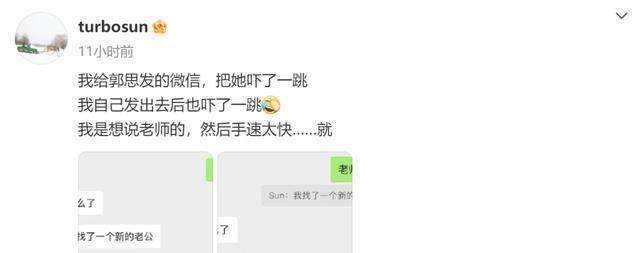 3月22日,演员孙俪在社交平台分享了两张聊天截图,还配上文字:“我给郭思发的微信消息,结果吓了她一跳,我自己发完也吓了一跳。本想说老师,无奈手速太快,结果就成了……”