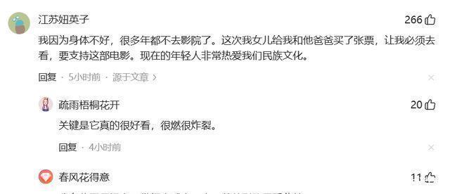 我因为身体不好,很多年都不去影院了。这次我女儿给我和他爸爸买了张票,让我必须去看,要支持这部电影。现在的年轻人非常热爱我们民族文化。