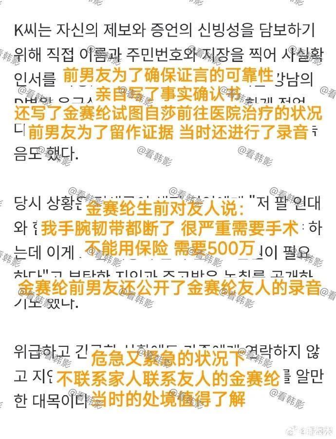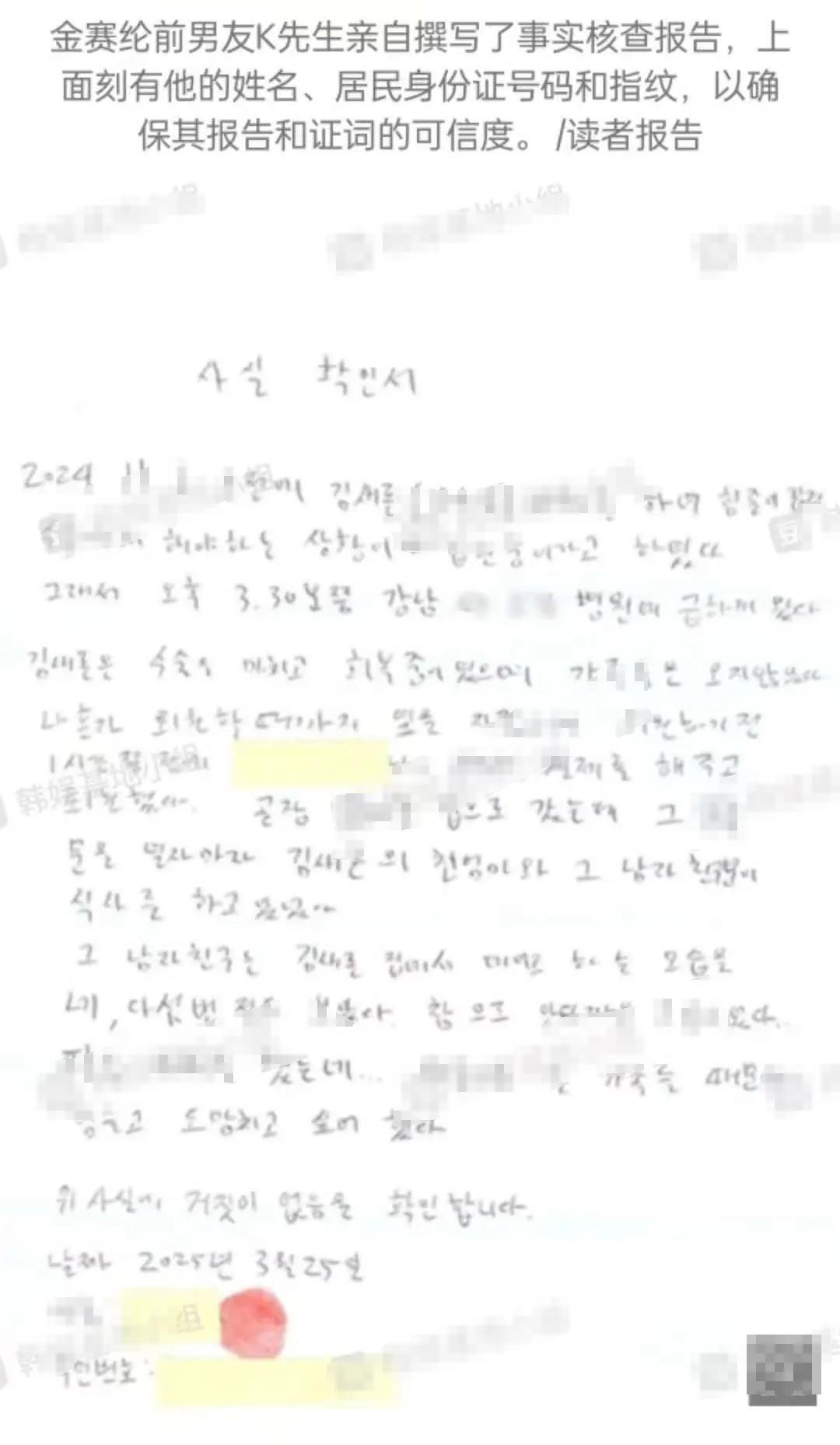这位自称前男友的爆料发声,与金秀贤的公关文高度重合,还把炮火对准了金赛纶母亲及家属,似乎是想传达金赛纶的一切都是家庭关系诱导,帮金秀贤撇清干系。至于他全程以金赛纶亲密者的立场发言,也是在给金赛纶泼脏水,谴责金赛纶男女关系混乱,徘徊在两个男人身边。既然前男友那么确定金赛纶已婚,那么应该拿出实质证据证实,而不是自言自语的手写信。而且事实确认书还是3月25日临时写的。