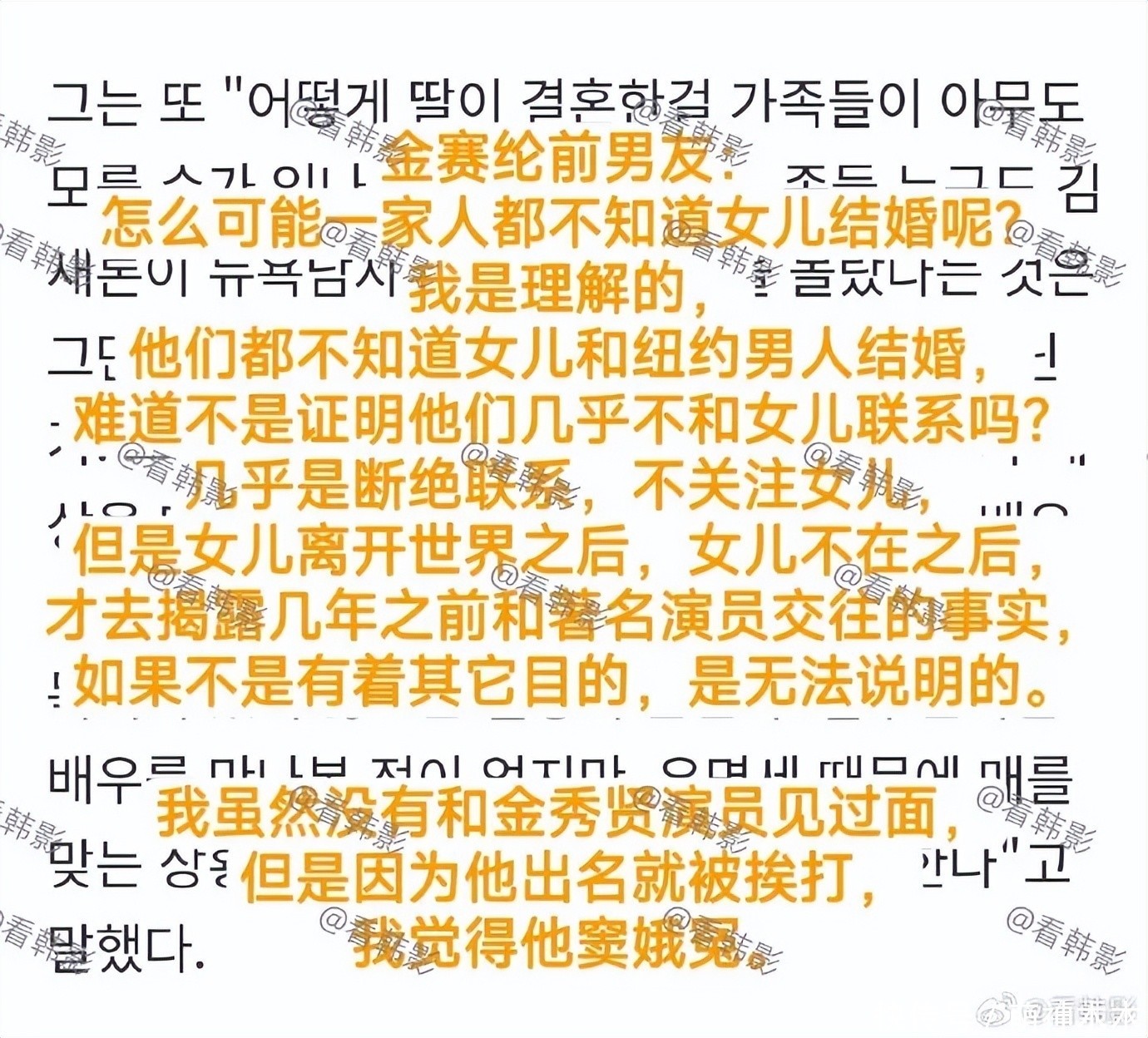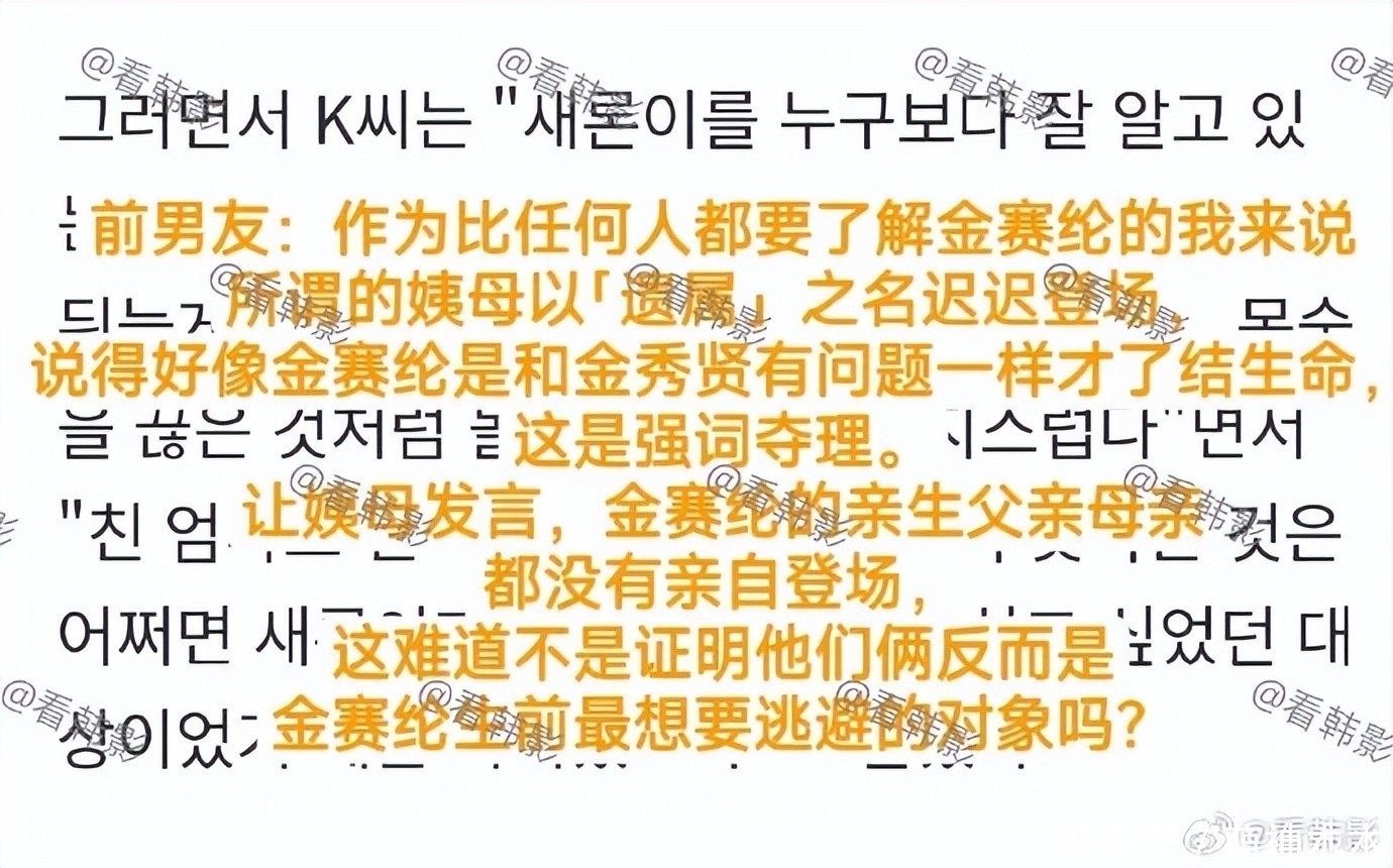 前男友还斥责家人怎么可能不知道金赛纶结婚,间接说明金赛纶家人不关心女儿,而在女儿死亡后揭露与金秀贤恋爱事实有其他目的,暗示家属图谋钱财。前男友还表示虽然没和金秀贤见过面,但是他因为出名被挨打很冤。