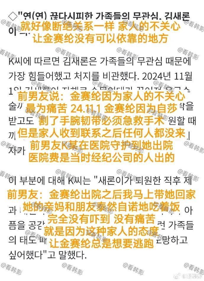 前男友称金赛纶家属与她几乎断绝关系,让她没有依靠。在2024年11月,金赛纶割腕自杀入院急救,金赛纶家人没有一人出面,前男友贴身照顾,医药费前公司出,金赛纶出院后家人也无所表示,这种冷漠态度让金赛纶一直想要逃离家庭。