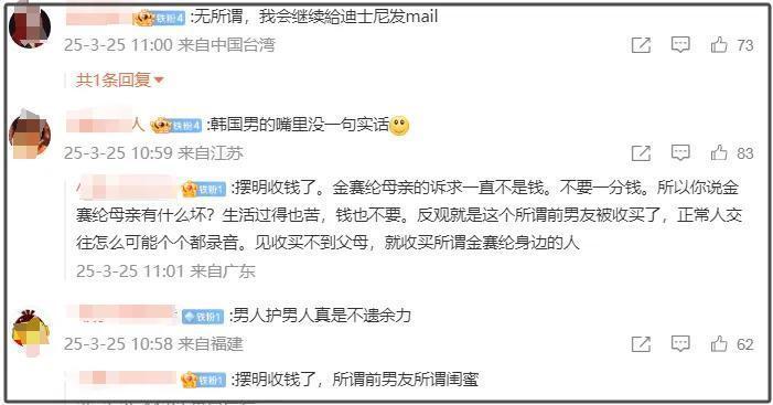 不少网友看到前男友的发声,并没有被相关说辞迷惑,坚持抵制金秀贤,继续向迪士尼发邮件投诉。还有网友认为前男友暗指金赛纶母亲向金秀贤要钱内心阴暗,从发声状态来看前男友才像被收买的一方。