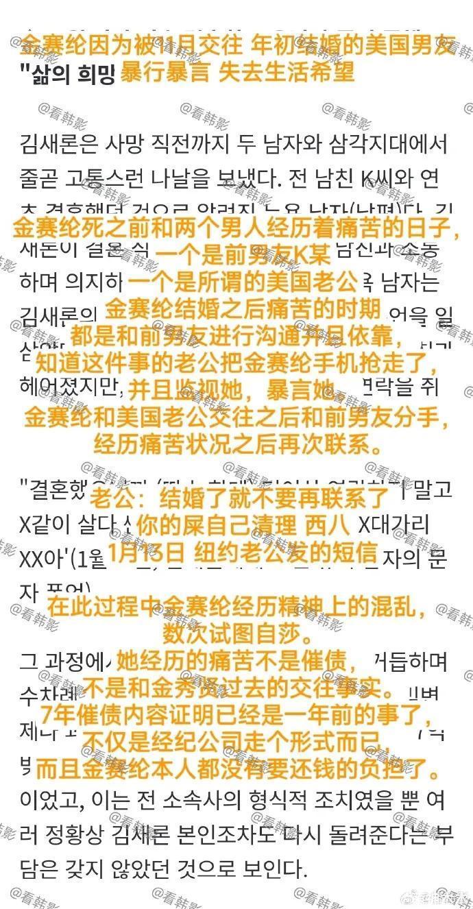 前男友透露金赛纶生前没有债务负担,但因为两个男人而痛苦,一个是前男友本人,另一个是纽约已婚丈夫。婚后因为对前男友有依赖,手机等遭到纽约丈夫监控,还被殴打,曾多次自残及ZS并向前男友求救。前男友还公开了一张脖子上都是伤痕的照片,由于没有露脸无法确认是不是金赛纶。