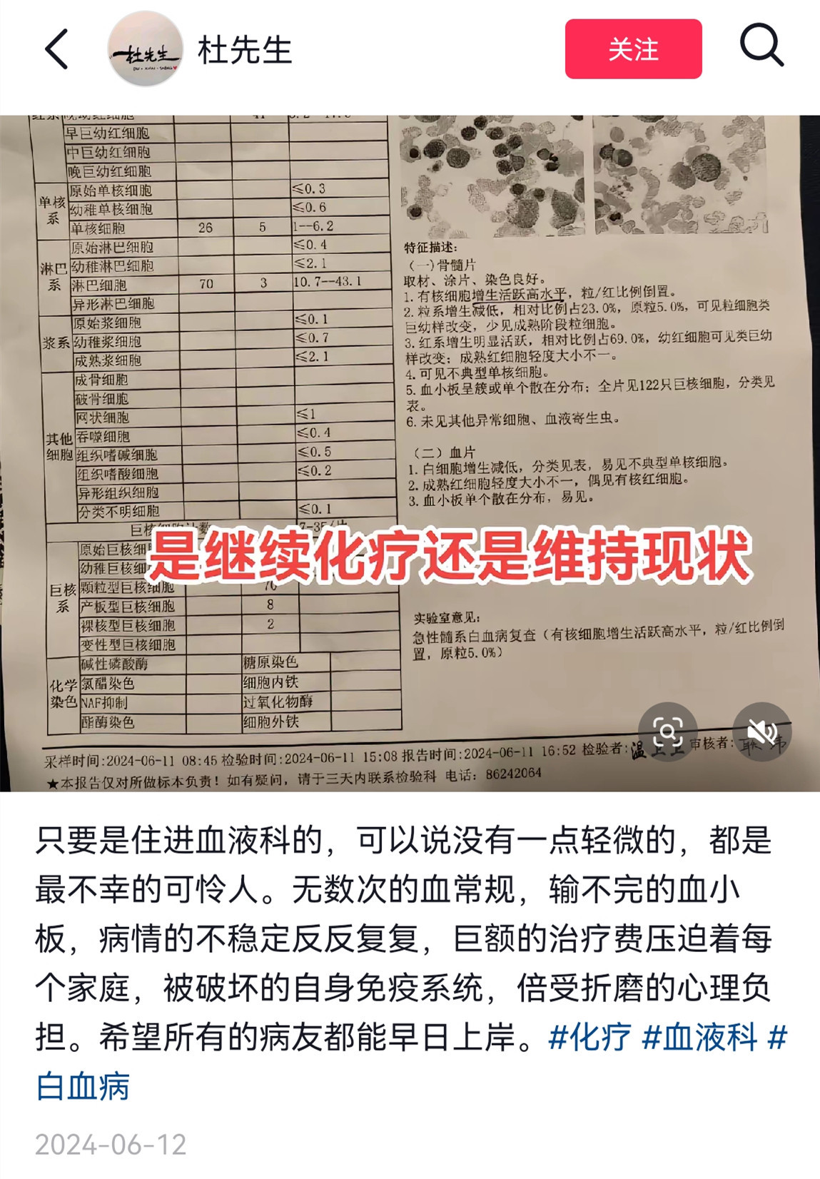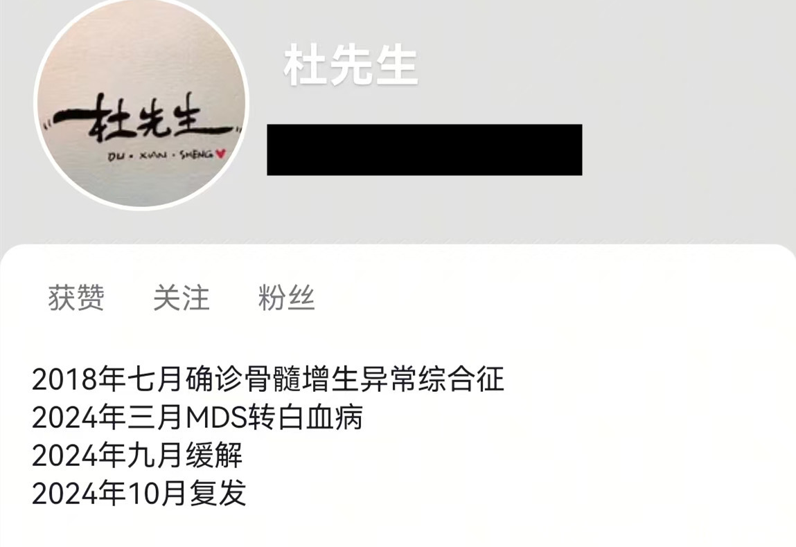 经过5年的治疗,杜先生的病没有康复,反而恶化了。他在2024年3月MDS转向白血病,经过6个月的治疗,病情得到缓解。