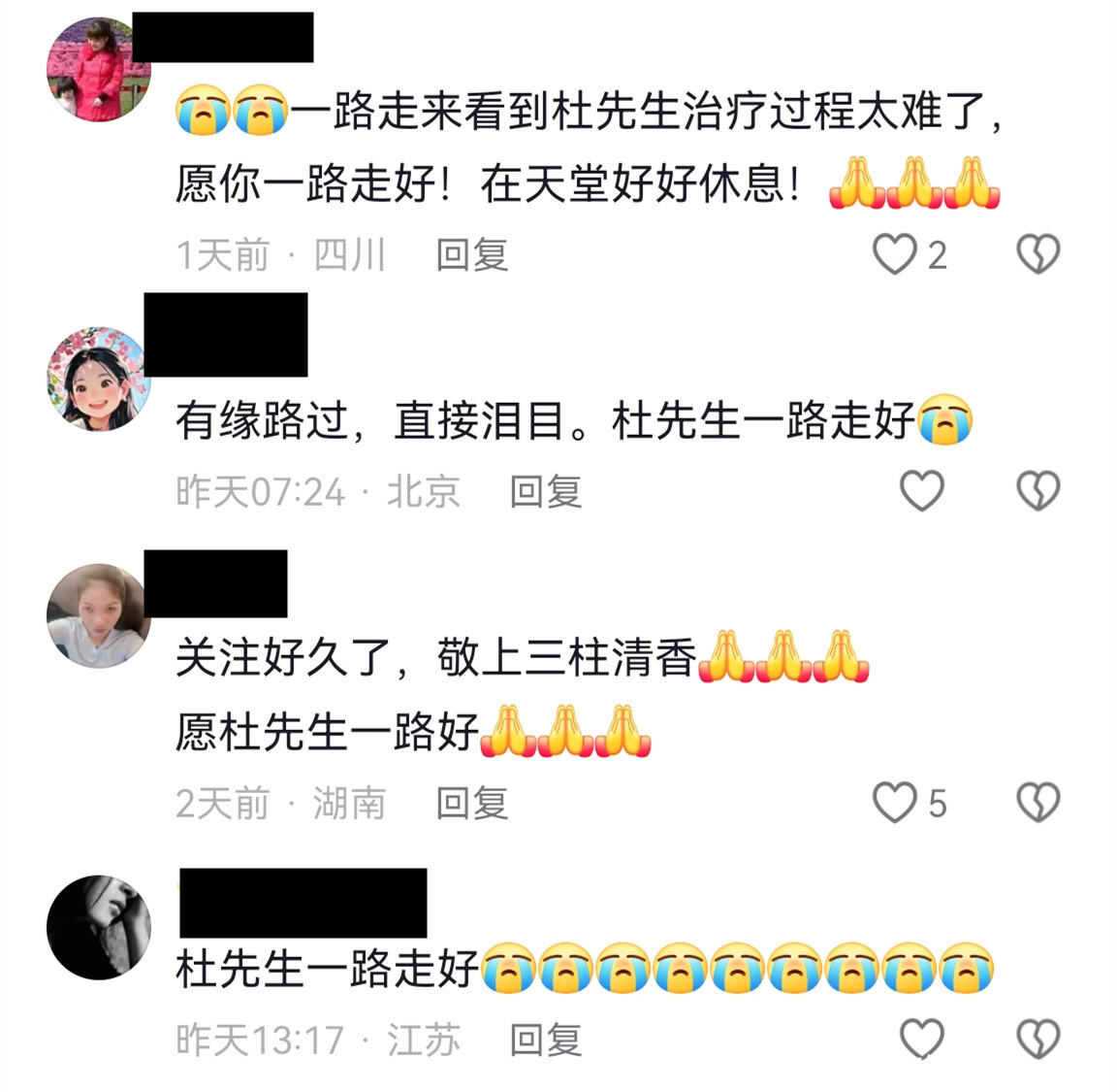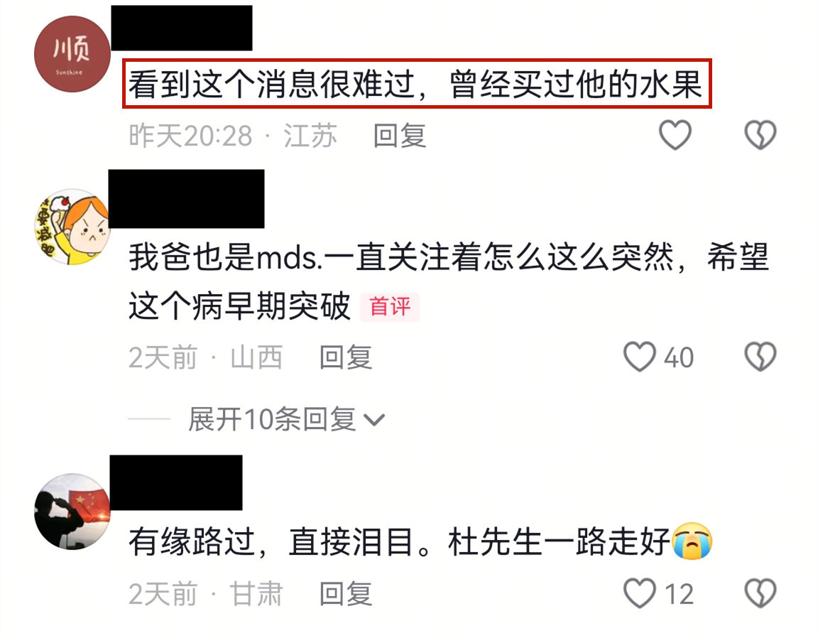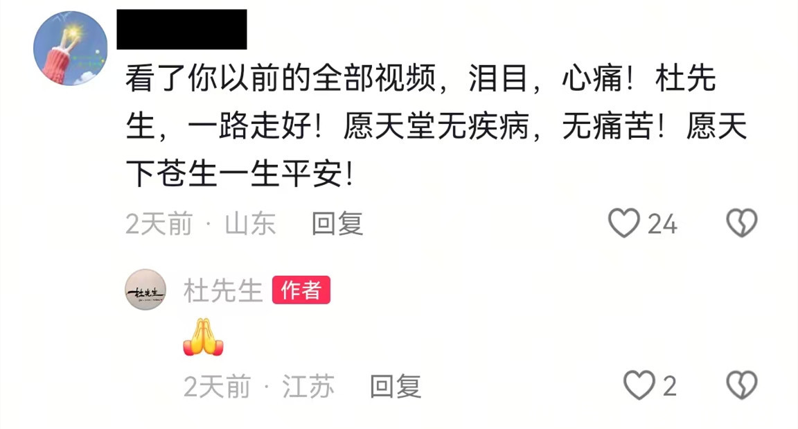 有网友写道:看了你以前的全部视频,泪目, 心痛,杜先生,一路走好!愿天堂无疾病,无痛苦,愿天下苍生一生平安。