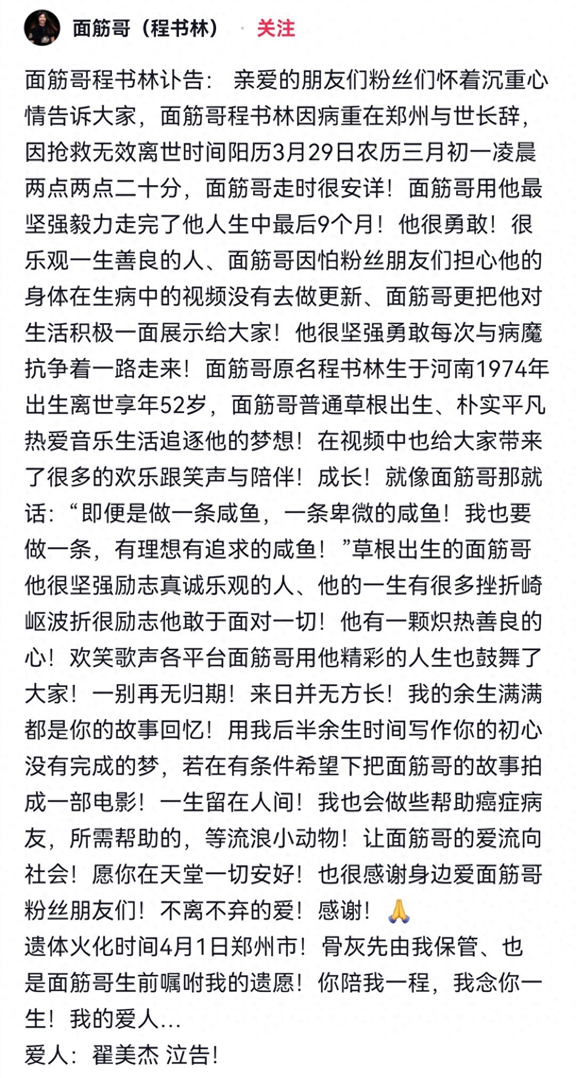 3月29日,杜先生的家人用杜先生的账号向外界宣告了杜先生去世的消息。