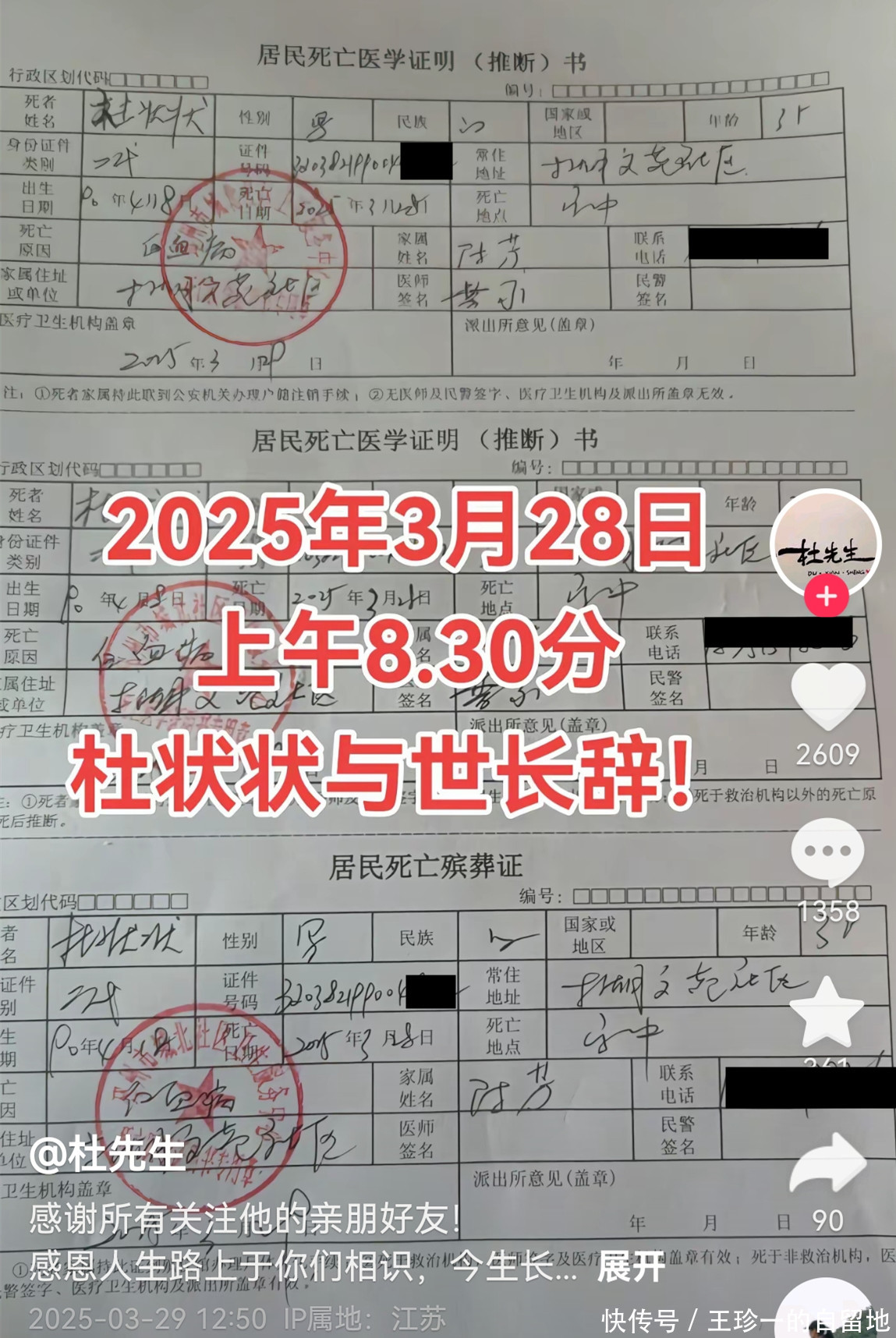 根据账号内容可知,杜先生是在2025年3月28日上午8时30分去世的,杜先生的家人发文“感谢所有关注他的亲朋好友!感恩人生路上与你们相识,今生长辞。”