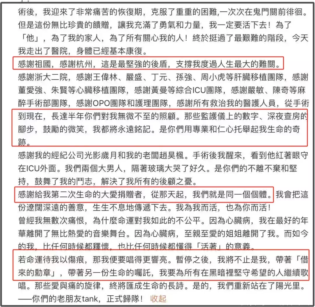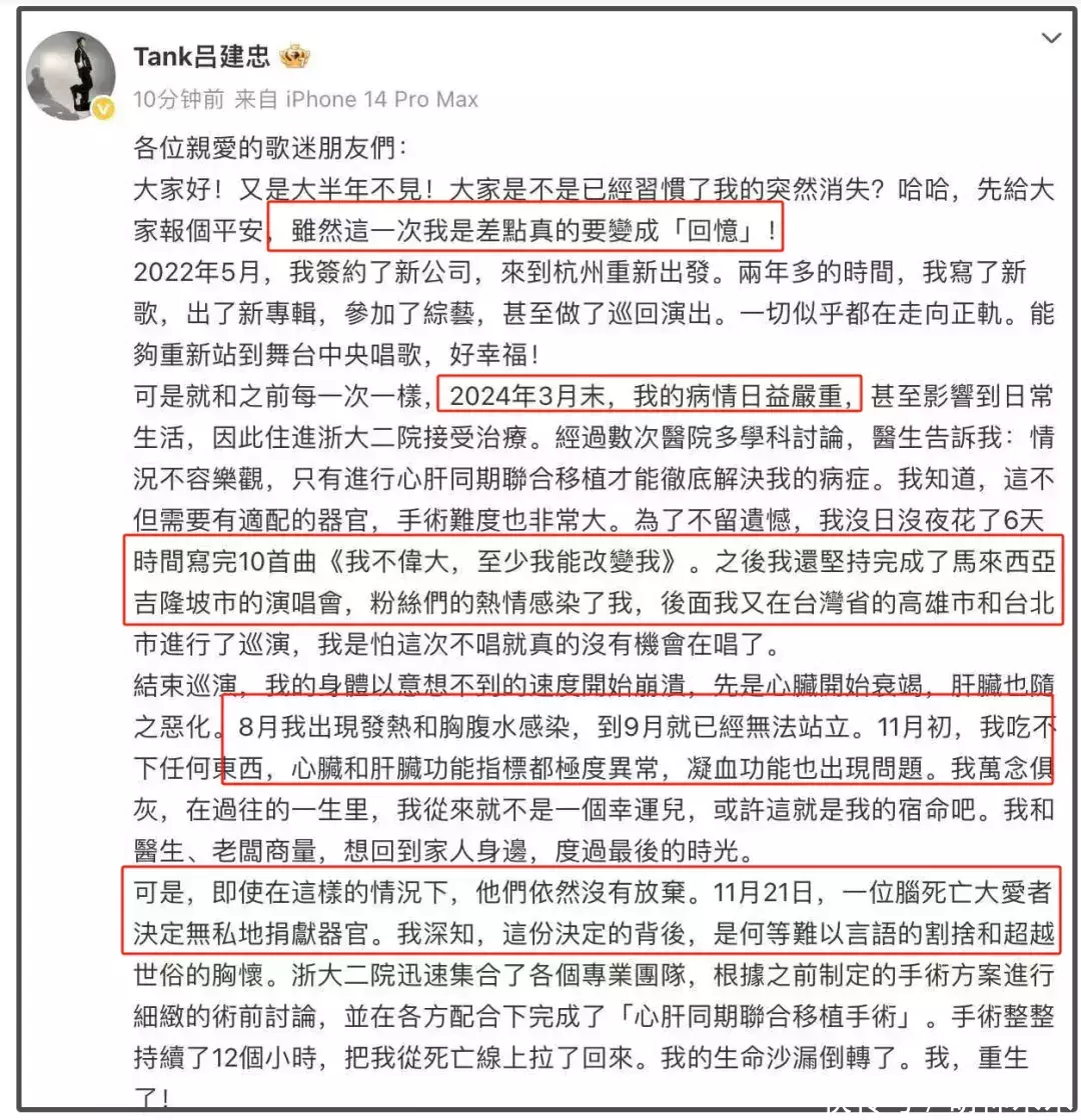 Tank发布的长文也是充满感叹,先是调侃大半年没见面差一点就要真的变成“回忆”,随后他详细地分享了从2022年5月签约新公司至2024年手术前发生的所有事情,称两年期间做了巡演、发了专辑,一切向好,但在2024年3月病情加重,就医后得知只有做心肝同期联合移植才能根治,为了不留遗憾花6天写了10首歌,还陆续在吉隆坡市、台湾省表演。