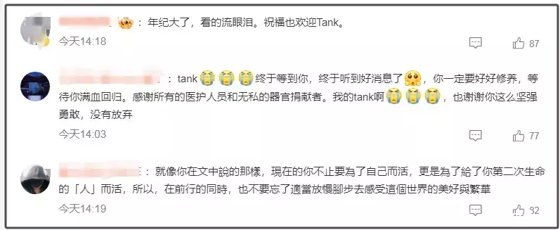 在术后康复阶段,Tank表示一次次在鬼门关徘徊,但捐赠的心意让他充满力量和勇气,为了捐赠者及家人朋友们挺过来了,感谢祖国感谢杭州,都是他最坚强的后盾,支撑他度过人生最大的难关。他还着重感谢了浙大二院医疗团队半年来的悉心照顾,以及经纪公司老板的不离不弃,在手术室门前耐心等待。