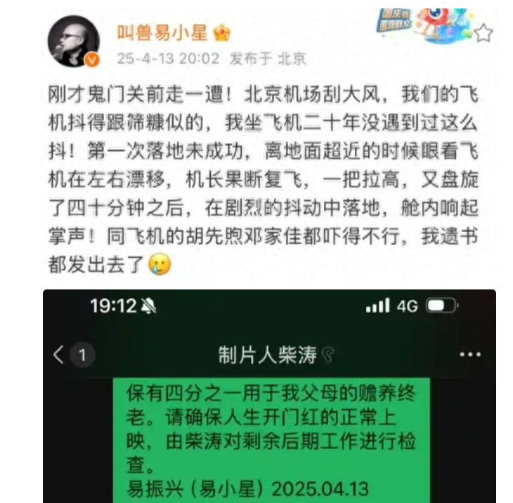 易小星发文说:“鬼门关前走一遭……飞机抖得跟筛糠似的,第一次落地未成功,离地面超近的时候眼看飞机在左右漂移,机长果断复飞,一把拉高,又盘施了四十分钟之后,在剧烈的抖动中落地……胡先煦邓家佳都吓得不行,我遗书都发出去了……”
