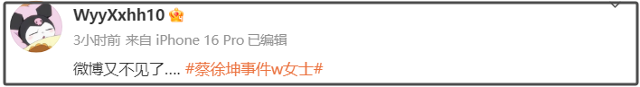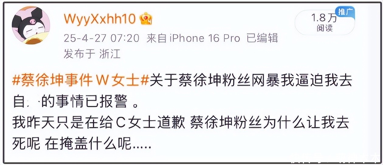 与此同时,蔡徐坤粉丝针对W女士的网暴行为一直没停,逼迫其进行极端行为,造谣其偷盗合影,W女士陷入自证旋涡,还就网暴报警,只是相关情况的微博一直被限制。