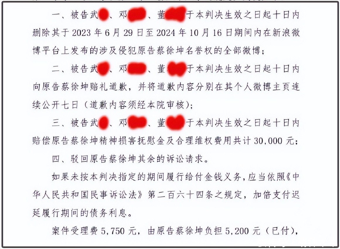 在完整判决书里,能看到法院认为W女士的行为构成侵害原告名誉权,有捏造恋人关系及制造虚假亲密照等行为,没有提及任何跟C女士相关的内容。而法院判决W女士与狗仔共同赔偿精神损失费及维权费用9万元,跟蔡徐坤诉求的百万精神损失费及9万维权费用完全不对等,可以看出法院对该事件的态度。