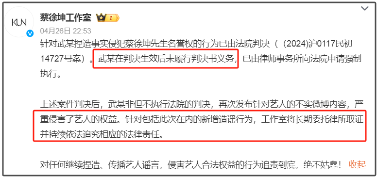 W女士针对“粉丝说判决书AI生成”等谣言也做了澄清,认证网络流传的判决书是真实的,晒出了更完整的部分,并晒出了法院驳回蔡徐坤告诽谤罪不予受理的截图。对于W女士的言论,蔡徐坤工作室也做出回应,表示“武某判决生效未履行判决义务”,疑似暗骂对方老赖,并表示针对“新增谣言”部分,会继续取证法律维权,认为W女士的言论都是污蔑和诋毁。