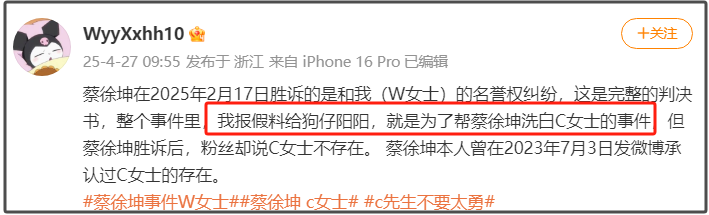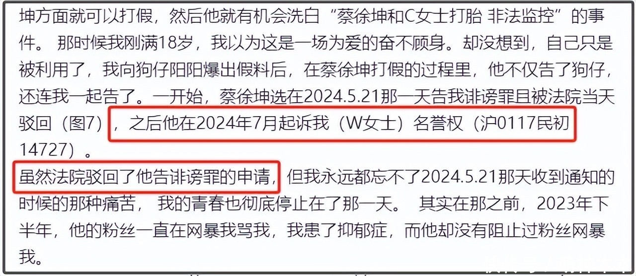 她透露2023年曾为转移“C女士堕胎及非法监控”事件,主动向狗仔提供“W女士未成年”的假料,意图通过蔡徐坤团队“打假”来洗白,没想到蔡徐坤方之后以“名誉侵权”起诉了她及狗仔,败诉后她承受了巨大的舆论压力抑郁了。此次发布长文的动机一是向受害者C女士道歉,二是撕破蔡徐坤虚假澄清“移花接木”的真相,给C女士一个公道。