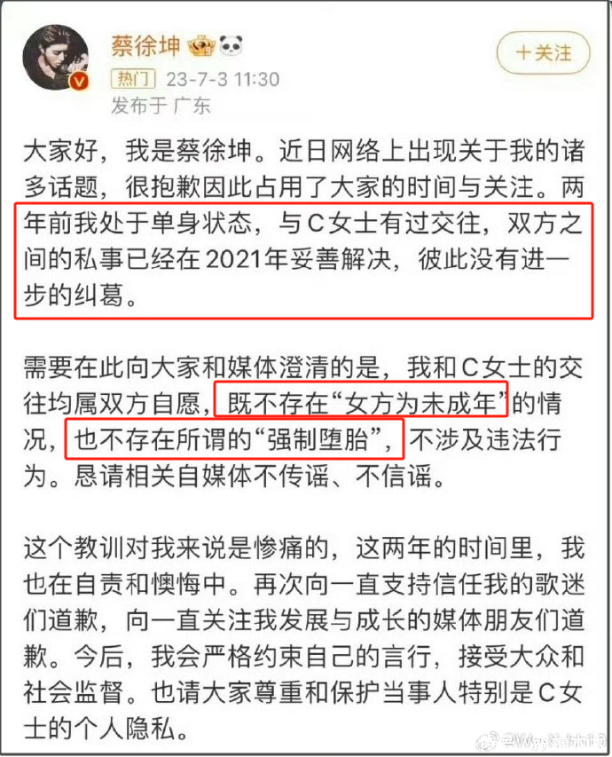 蔡徐坤当初承认与C女士有过一段交往,双方纠葛于私下妥善解决,并没有否认网传的“谅解书”及“非法监控女方录音后续”等违法行为。如今,W女士重提C女士风波,蔡徐坤律师也没有明确指出对方造谣的具体行为,很难完全澄清。