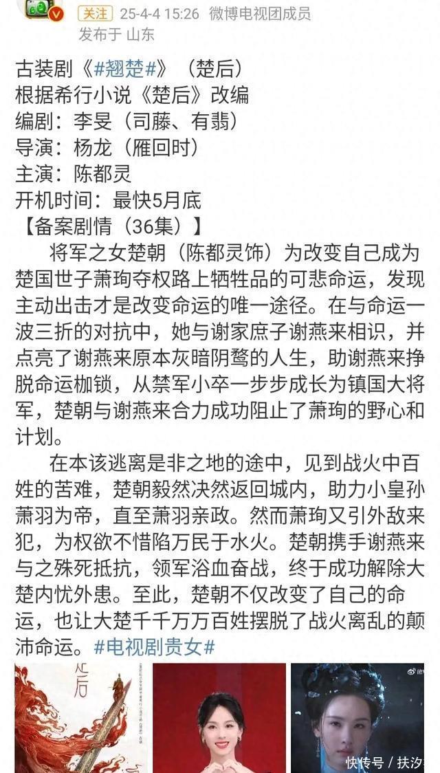 最新消息,古装剧《翘楚》(原名《楚后》)女主定下了陈都灵。