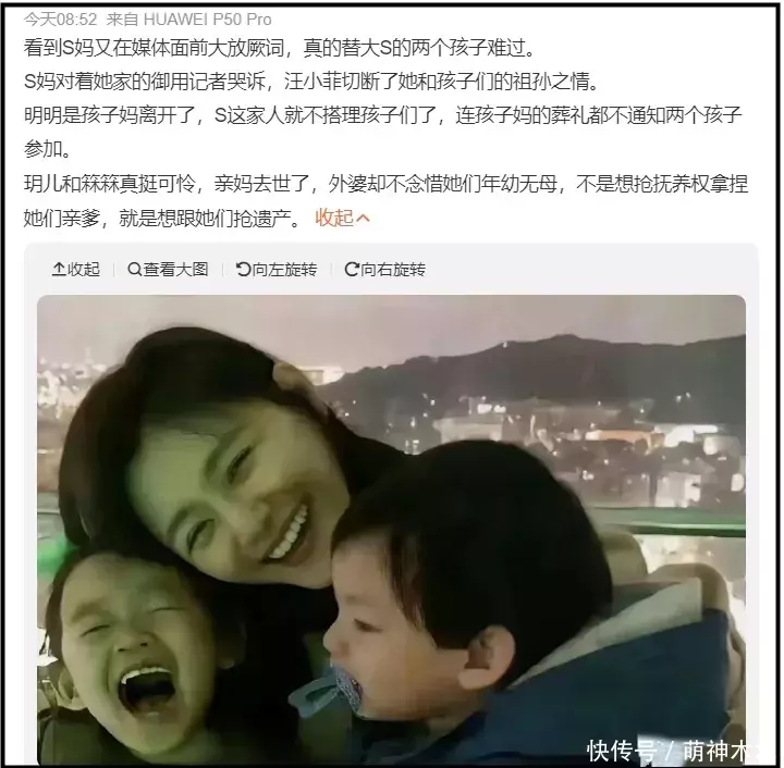 但是很快,S家和具俊晔发现,大S的子女是遗产第一继承人,如果让孩子继承更多遗产,他们的份额就少了,S家和具俊晔的态度有了变化,能不提孩子就不提孩子——两个孩子都是老汪家的,和我S家有什么关系?