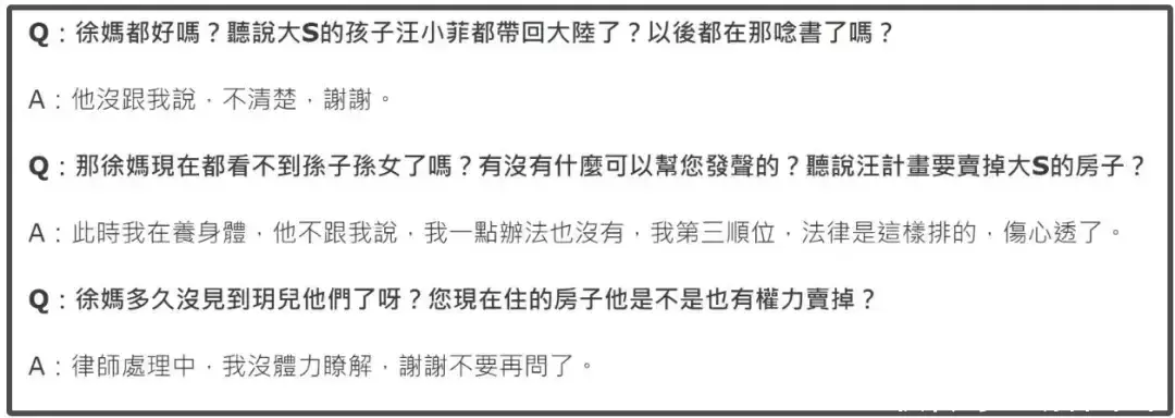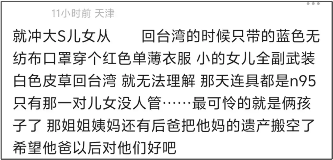 正如网友所说,S家再怎么表达悲痛,一想到他们刻意把大S子女排除在外,百日都不带他们过,都觉得虚伪。
