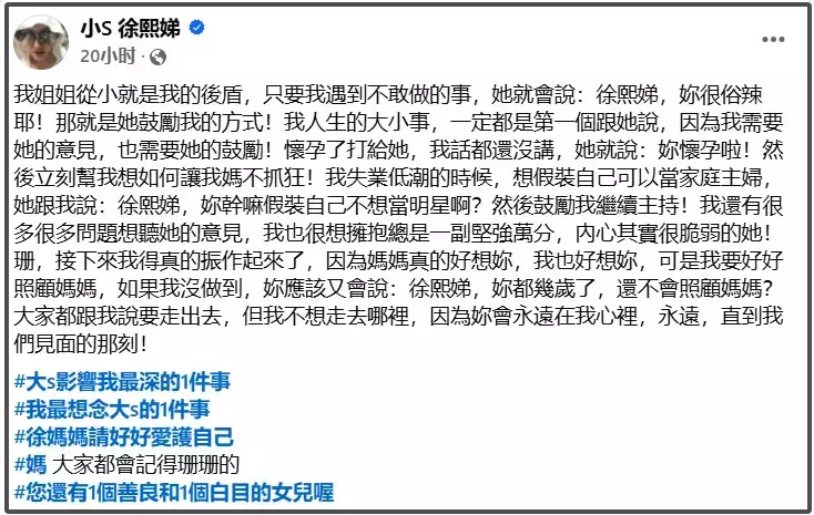 可能有人觉得,家人去世本来就是一辈子的伤痛,S妈白发人送黑发人,小S失去依靠了半辈子的姐姐,怎么就不能表达悲痛了,难道就因为有人质疑,她们就得躲起来一句不提吗?