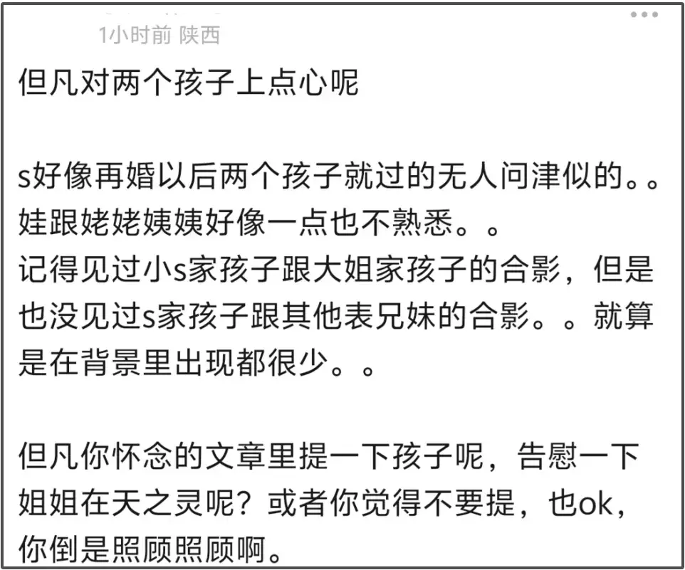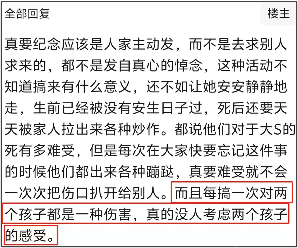 或者,人人皆知,由S家发起的大S百日悼念,本就不是源于真心,但凡有一点真心,怎么会把大S的一双子女彻底排除在外呢?