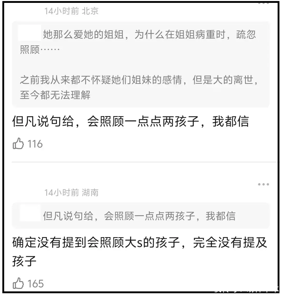 最后感慨,小玥儿和小箖儿是大S留在世间的唯二骨血,却被妈妈的血缘亲人如此对待,有时候真的不是外界苛责S家,而是他们的做法令人齿冷。
