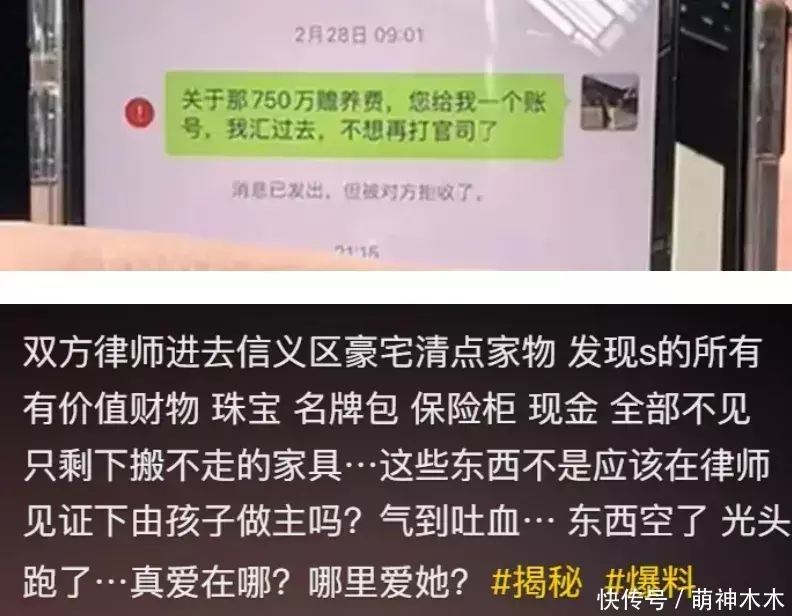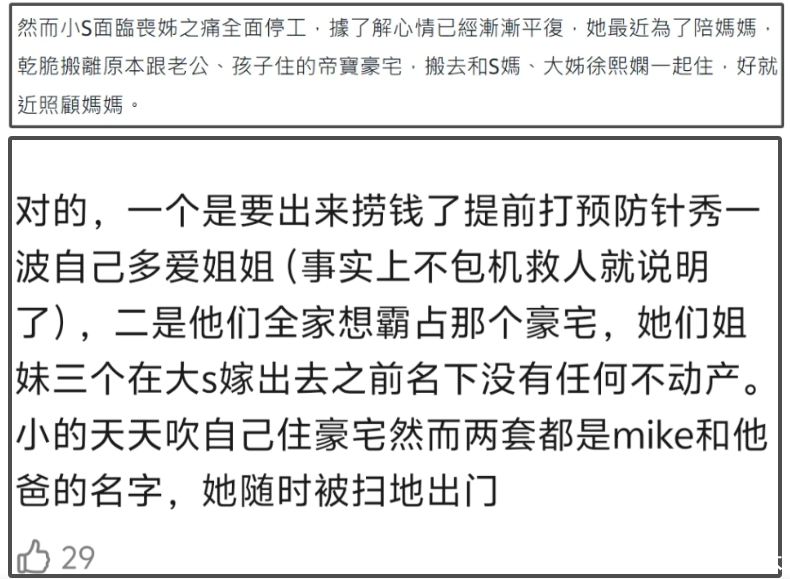 联想到大S留下两个豪宅,一个被S妈牢牢霸占,小S都搬进去住了,一个因为房贷未清成了烫手山芋,里面贵重物品被搬空,房贷甩给了两个孩子承担。