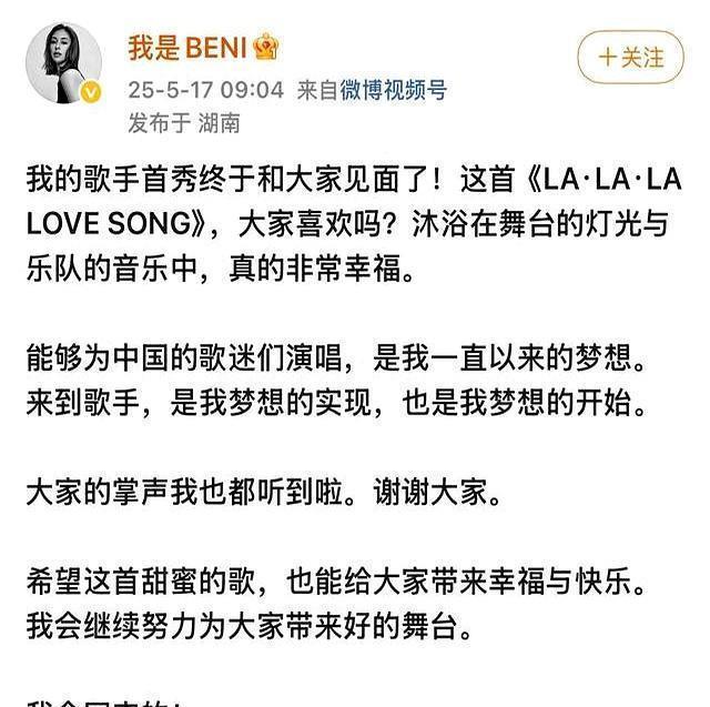 日本歌手BENI发文回应《歌手2025》被淘汰:我会回归的