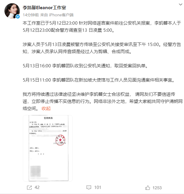 5月21日,@李凯馨Eleanor工作室 本工作室已于5月12日23:00 针对网络谣言案件前往公安机关报案,李凯馨本人于5月12日23:00配合警方调查至13 日凌晨 5:00。