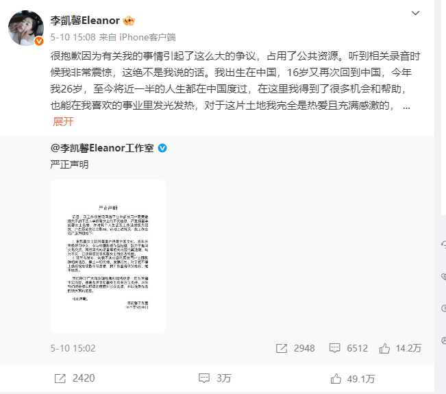 此前,李凯馨前助理曾曝光一段录音,其中李凯馨被指称“来华仅为赚钱”等,包含疑似贬损中国观众的内容,引发热议。