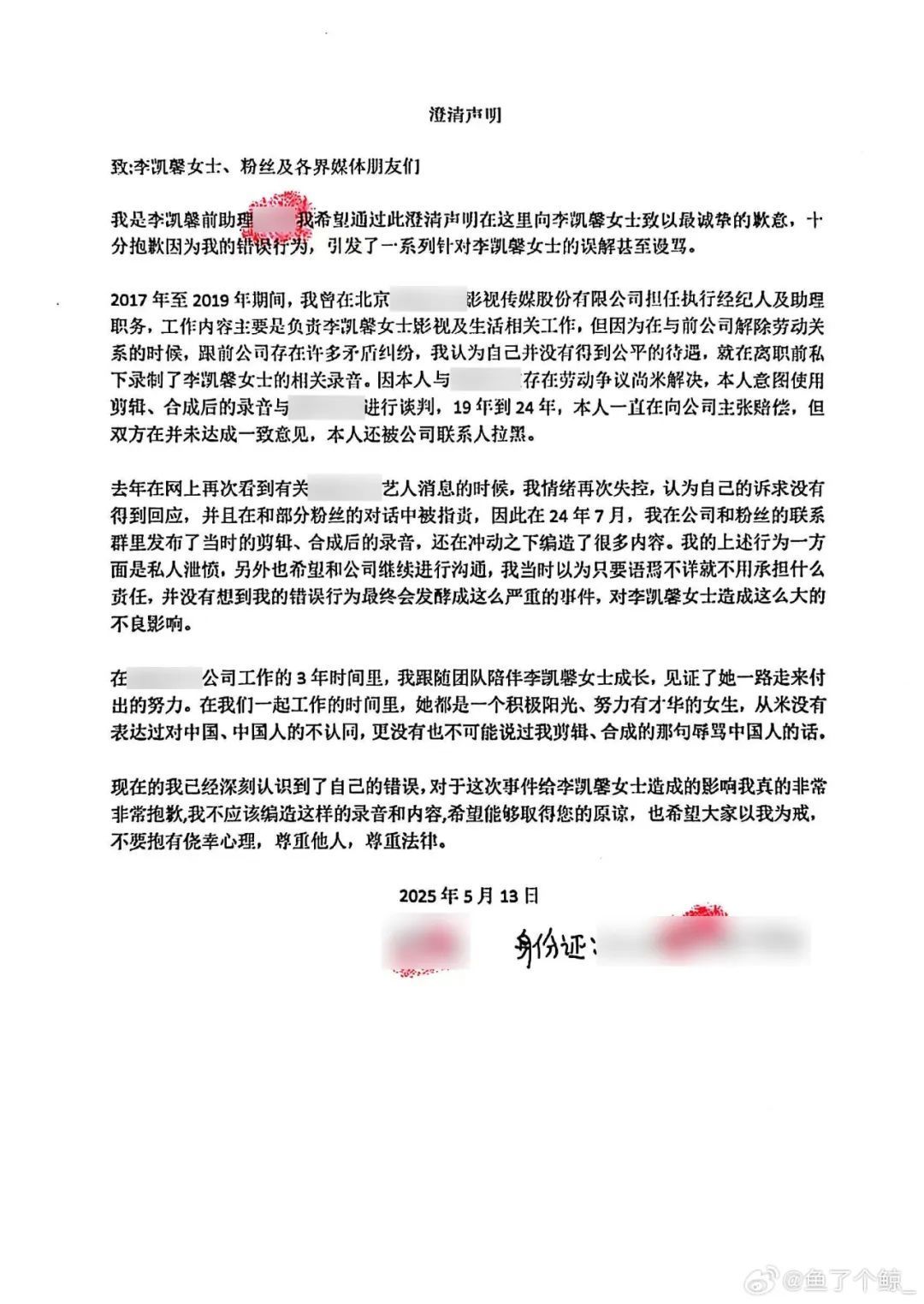 5月21日,@鱼了个鲸_ 发文:大家好,我是李凯馨女士前助理小胖。经公安机关批评教育,我深刻认识到恶意剪辑、合成、捏造李凯馨女士“辱骂国人”录音等传播虚假信息的行为涉嫌违法,对李凯馨女士造成严重名誉损害。现特做出澄清并对@李凯馨Eleanor 郑重致歉。本人已深刻认识错误,在此郑重承诺永不再犯,也恳请公众立即停止传播相关谣言,维护清朗网络空间。