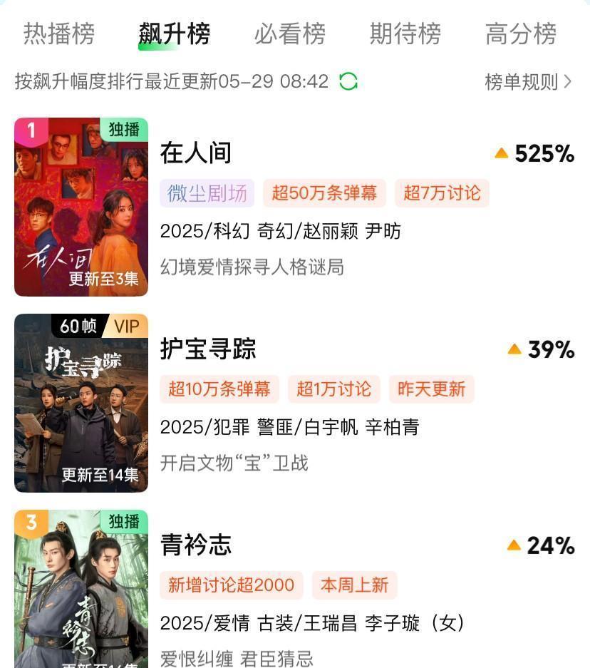 《在人间》上线首日就拿下超525%的飙升热度。它以悬疑+奇幻的元素打破大众对悬疑剧的固有认知。故事从虚拟游戏切入,玩家可选择不同形象参与游戏。首场密室逃脱游戏中,暗恋女主贾小朵(赵丽颖饰)的徐天(尹昉饰)选了贾小朵的形象进入游戏,任务是从诡异火车逃脱,车厢里会遇到不同故事的人,列车行驶场景奇幻。徐天以为逃脱成功,却迎来第二场游戏,和贾小朵及她前男友攀岩,而攀岩空间也十分奇特,贾小朵还有诡异举动,背后真相扑朔迷离。
