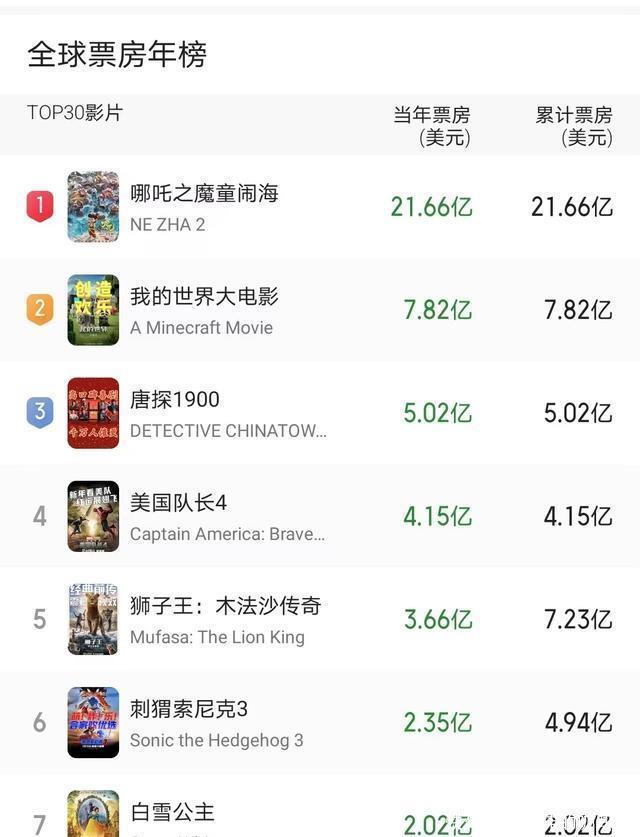 三部国产片挺进全球年度票房榜前十,《哪吒2》稳居第一。