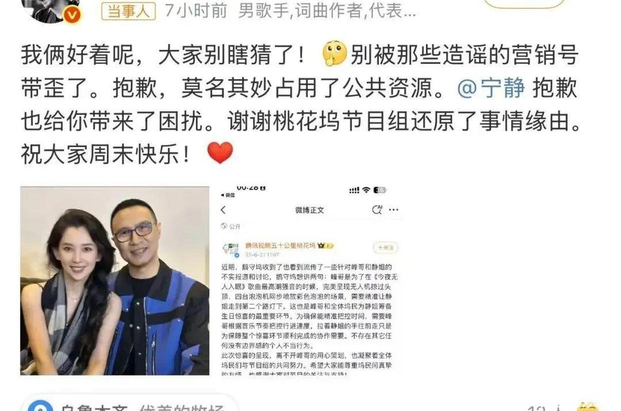 不过汪峰倒也及时,上线灭火“我俩好着呢”,顺便还道个歉,说给宁静添了麻烦。