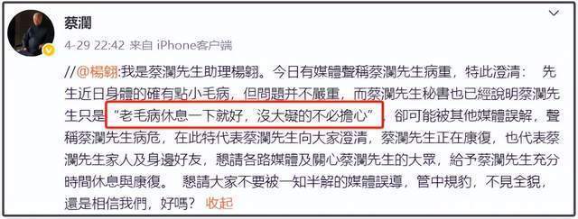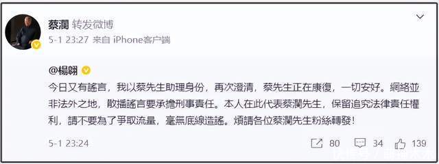 蔡澜助理发文称“蔡澜正在康复,一切安好”,将用法律手段惩戒造谣博流量的无底线行为。助理还透露蔡澜身体只是小毛病,并不是特别严重,相关回应蔡澜均转发支持 。而蔡澜本人也单独发文回应谣言,感谢大家关心他的健康,但没有到病危的程度,让大家不要担心。可见他本人的心态还是保持得很好。