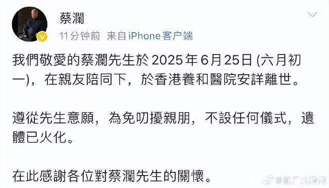 6月27日,有网友分享了一张悼念蔡澜去世的朋友圈,引发热议。随后,蔡澜的微博由身边人发布证实,表示:“我们敬爱的蔡澜先生于2025年6月25日(六月初一),在亲友陪同下,于香港养和医院安詳离世。”