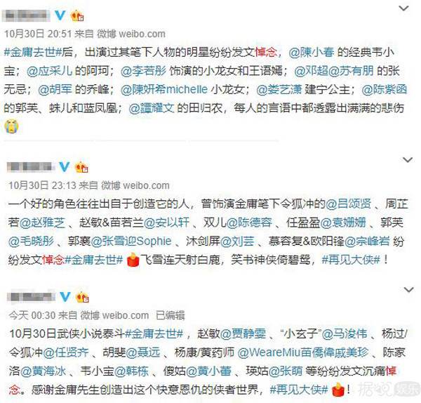 这么多年来,金庸小说被改编为影视剧的次数多达100余次。所以金庸去世的消息一出,大半个娱乐圈都陷入了哀思。