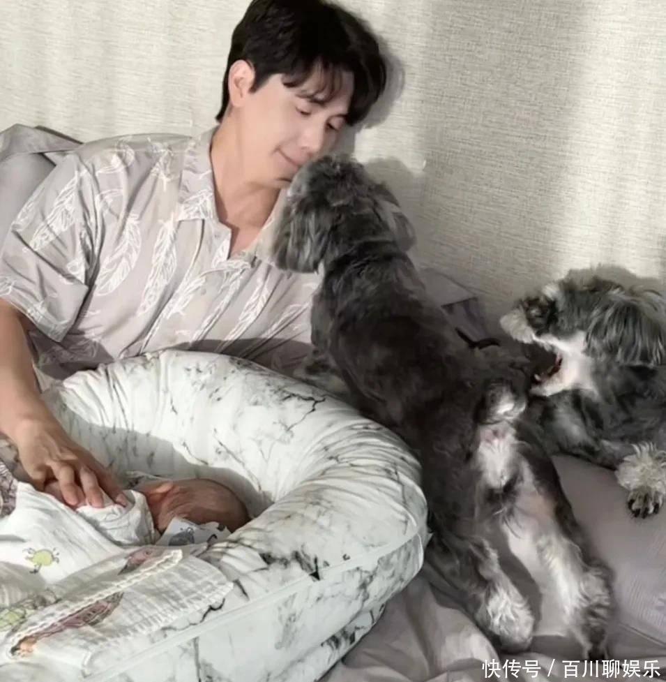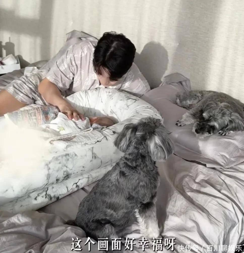 从月子会所回到自家后,家里的两只狗狗对新添的家庭成员十分喜爱。当小五躺着照顾宝宝时,两只狗会跟着趴在床上,一起看着宝宝。两只狗加上一个宝宝,画面显得格外热闹。