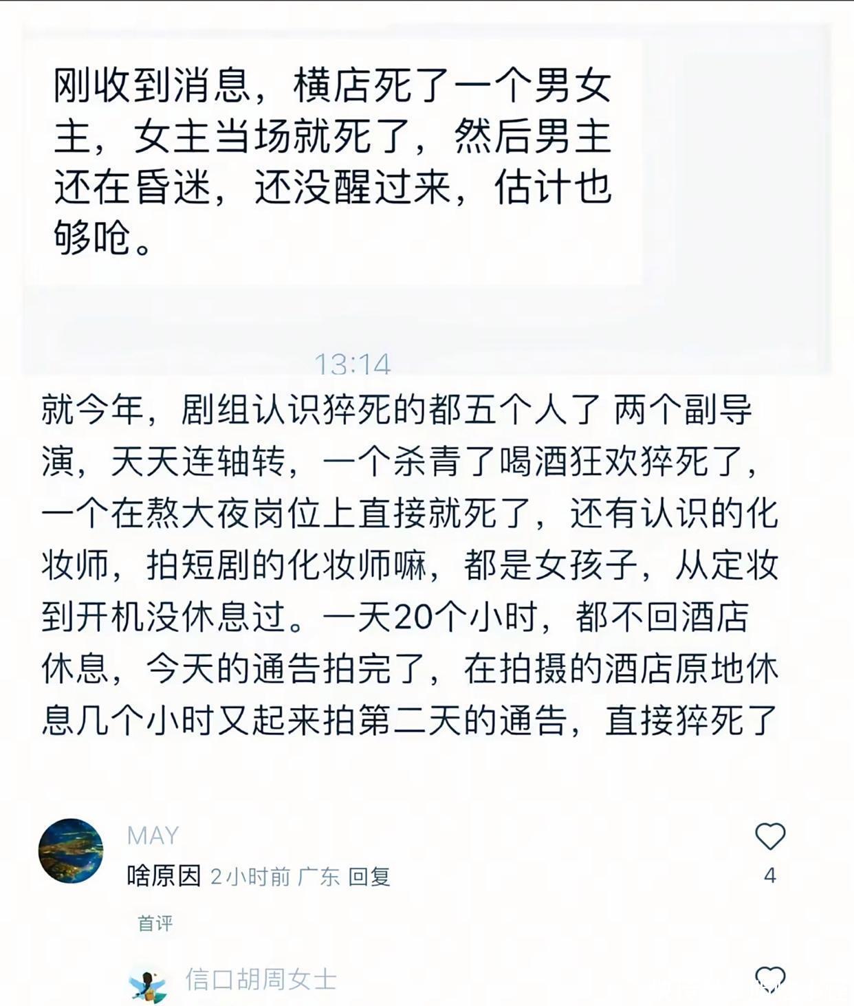 我们来简单分析一下这个信息,首先是两个人都倒下了一个人说是已经死亡,另一个还在昏迷抢救当中。而且聊天记录中被问及什么原因时,有人回复是“连续熬”不少从事短剧行业的演员都分析了这个事情,他们表示很可能是因为中暑昏迷导致,因为现在横店,夏天其实是非常热的,拍片子的时候酷热难。一些演员受不了,很可能会因为天气热中暑或是热射病猝死。